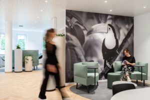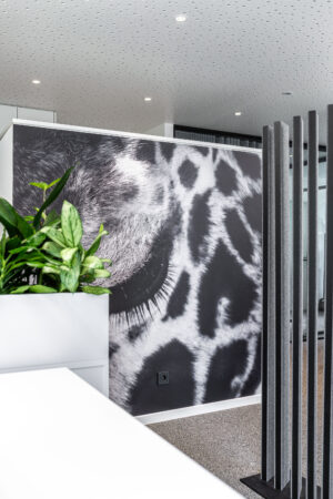 Georg Albrecht: Das neu gestaltete Büro sollte hell und freundlich sein, mit großen Bildtapeten, vielen Pflanzen und optimaler Nutzung des Raumes. Zusätzlich haben wir Räume mit Glaswänden und Vorhängen kreiert, die sowohl teaminterne Gespräche als auch ruhige, ungestörte Kundenberatungen ermöglichen. Außerdem haben wir in Absprache die Wünsche der Kollegen einfließen lassen. So gibt es beispielsweise nur noch an einem Tag eine Abteilungsregel bei den Arbeitsplätzen – an den anderen können sich alle Kollegen im Büro flexibel einen Platz aussuchen. First come, first serve – jeder Platz ist gleich ausgestattet. So bleibt alles lebendig und regt den teamübergreifenden Austausch an. Jeder Mitarbeiter hat zudem ein eigenes Schließfach mit persönlichen Unterlagen. Auch in puncto Nachhaltigkeit sind wir technisch nun auf dem neuesten Stand: Unsere Beleuchtung wird über Bewegungsmelder gesteuert und hilft so, Energie gezielt und effizient einzusetzen. Gleichzeitig haben wir eine Wärmepumpe sowie eine Photovoltaikanlage installiert – ein starkes Duo für umweltfreundliches Heizen und die Erzeugung erneuerbarer Energie direkt vor Ort. So können wir einen Teil unseres Strombedarfs selbst decken und unseren CO2-Fußabdruck deutlich reduzieren.